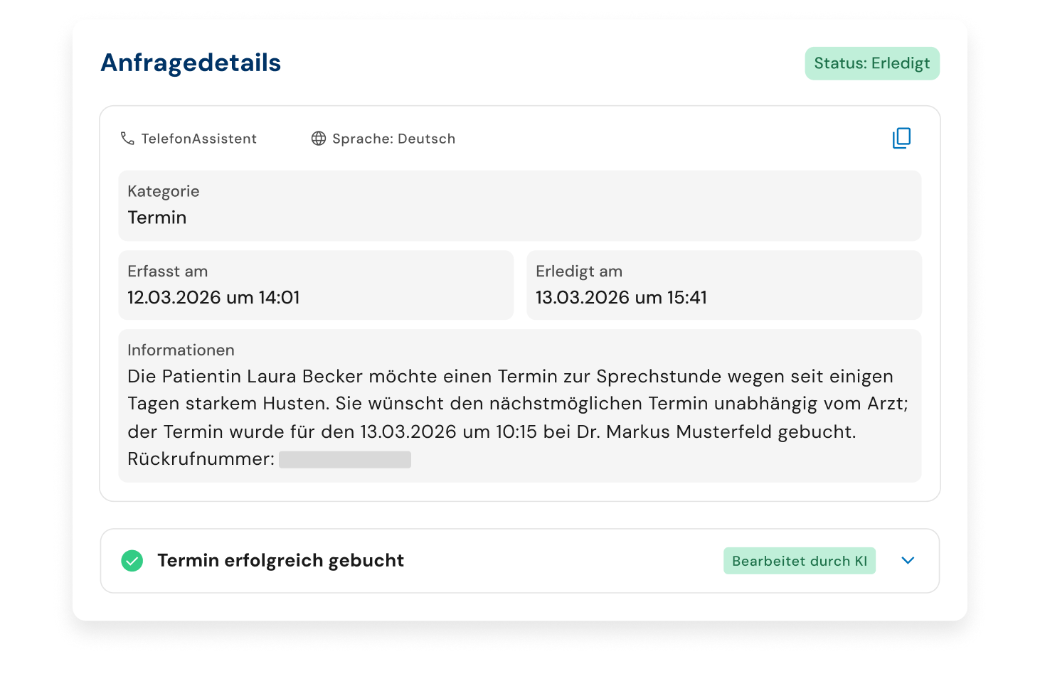 Unser Telefonassistent fasst alle Anliegen Ihrer Patientinnen und Patienten – ob telefonisch oder online eingegangen – in einer übersichtlichen, strukturierten und bearbeitbaren Liste, inklusive kurzer Zusammenfassung direkt in der Anrufübersicht für eine schnelle Ersteinschätzung, zusammen.